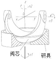 雙偏心半球閥密封面的研磨采用如圖1(a)所示的凸凹圓弧對偶研磨。為保證研磨質量,研具的磨損應均勻,工件表面上各點研磨行程應一樣,工件上任一點的運動軌跡應不斷變化,盡量遍及整個研具表面。通過模擬實驗及實踐證明:研磨軌跡為正弦波軌跡,其幾何精度、表面質量可以 達到較高的水平。正弦曲線軌跡的優點是軌跡不易重復,磨削條紋能夠有規律地交錯,砂粒尖刃容易鈍化,有利于減小表面粗糙度值。研磨軌跡能遍及球面表面,就能較好保持閥芯環狀球面的圓度。